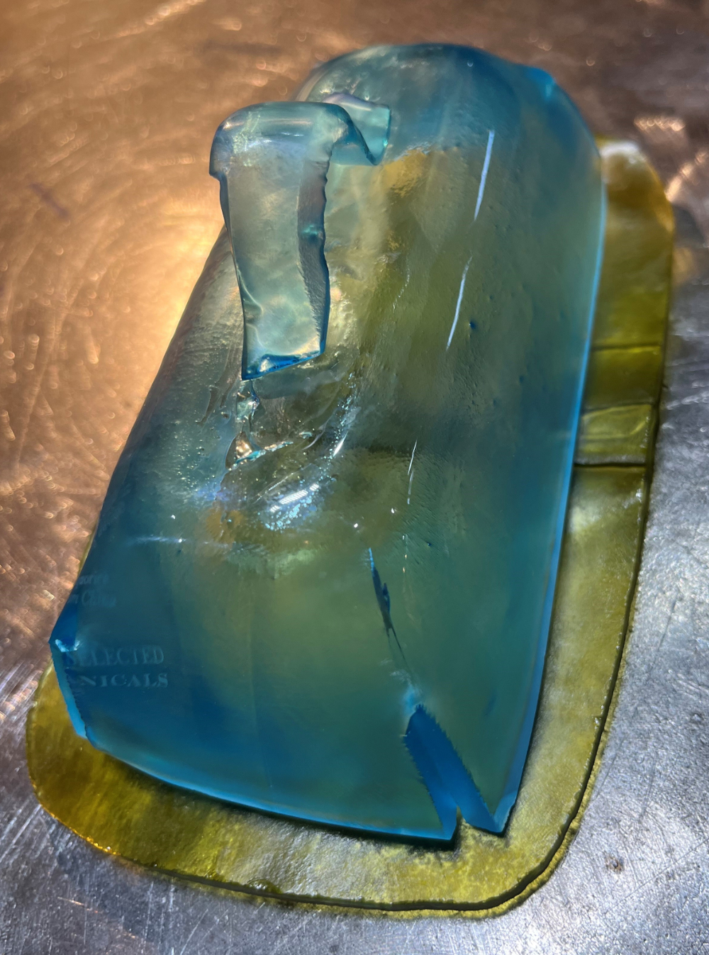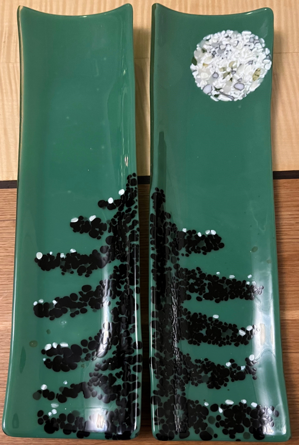 Three sushi plates completed for a wedding gift. Base glass used in all three plates are identical. The back surface was flipped on one of the plates. A chinese wedding symbol was incorporated into one of the plates using 96 COE flat stringers preformed into the symbol and fused into the glass. This created an instability which caused the plate to break. The plate was successfully rehealed. However in the slumpint phase, the plate was slightly too large for the mold and cracked again, probably because of the original instabilitly. In healing the glass, contaminants were introduced creating a dirty appearance. Subsequent firings with superficial frit created a very interesting effect in the center plate. The backside of that same plate took on an antique characteristic - almost like blue stone.